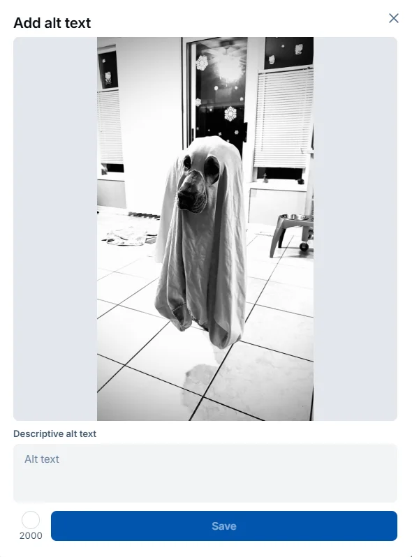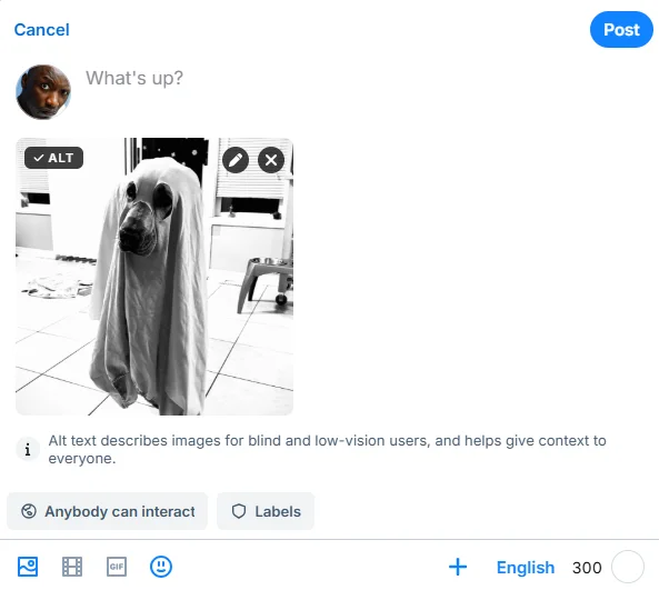 So: how does one actually add this text to an image? Well, when an image is posted, you can see a small overlay at the top left that’s labeled “+ALT.” Click/press/tap there and a dialogue will magically appear, asking for up to 2000 characters of descriptive text to be appended to the image. Once the image is posted a similar overlay will appear at the bottom right of the posted image. Click/press/tap there, and you’ll be able to read any text that’s been appended to the image in this manner. And hey…don’t forget to add transcriptions to all-text screen caps as well. They’re not always recognized and read by screen readers.