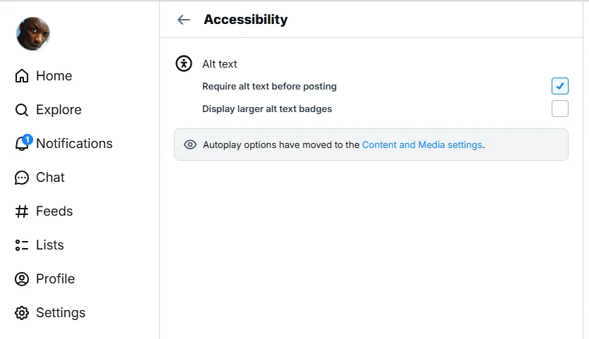 So, if you are in a position to be able to add this alt text to your images, fantastic. You can even toggle a setting (Settings > Accessibility > Require alt text before posting) that makes it mandatory for any posted image to have something in that field before it's eligible to be published.